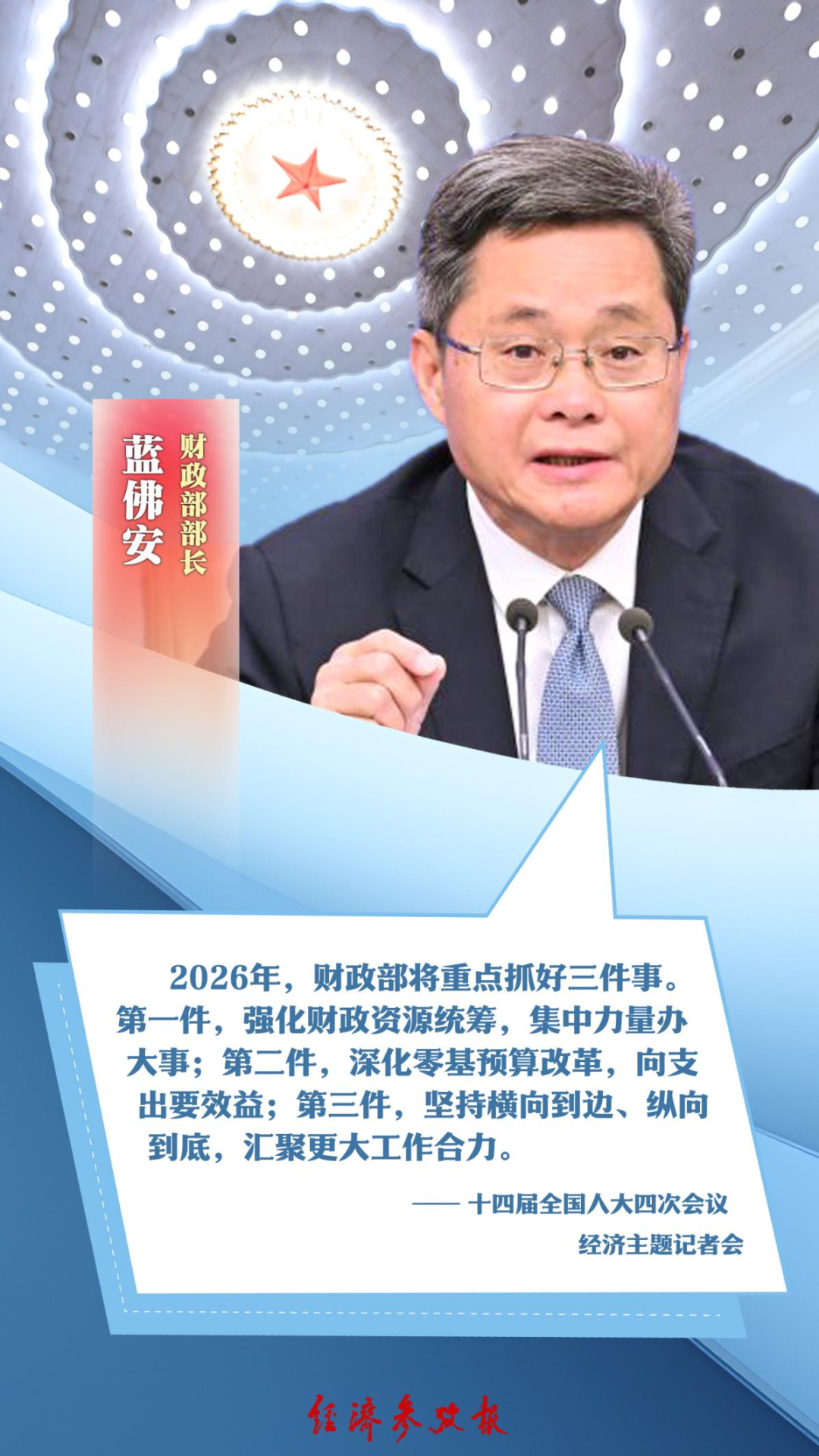 财政是国家治理的基础和重要支柱。3月6日, 财政部部长蓝佛安在十四届全国人大四次会议经济主题记者会上表示,党的二十届四中全会把加强财政科学管理,作为“十五五”规划建议的重要内容,这是党中央交给财政部门的一项重要任务。2026年,财政部将重点抓好三件事。