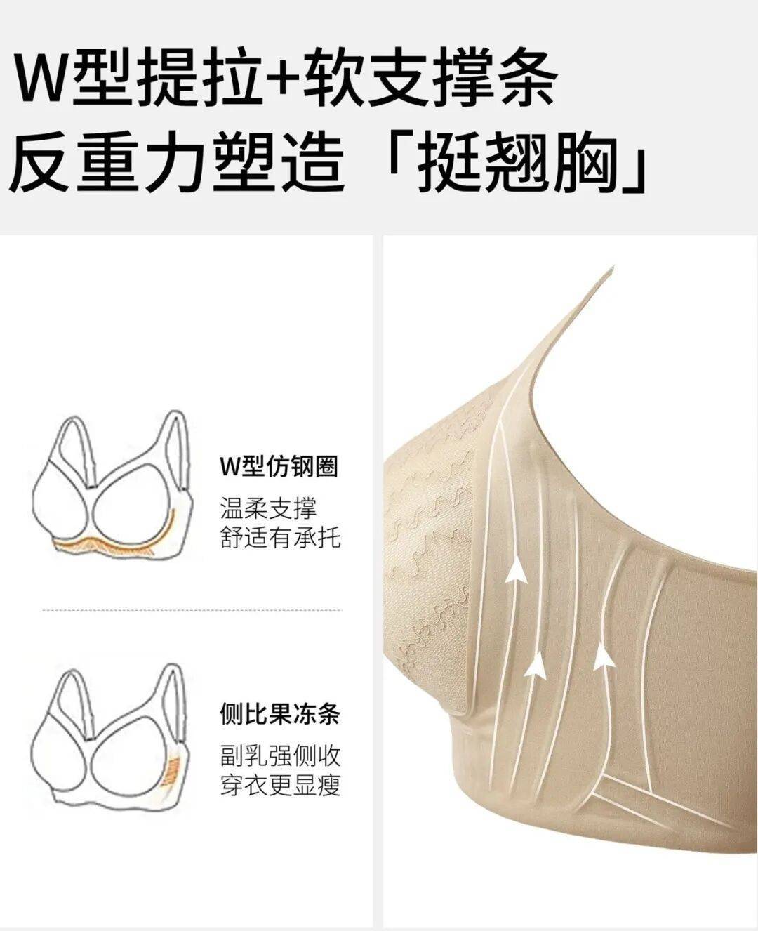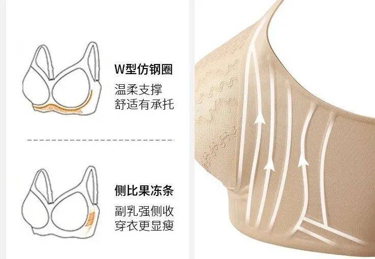 无钢圈、不靠勒,自然提拉聚拢胸部。