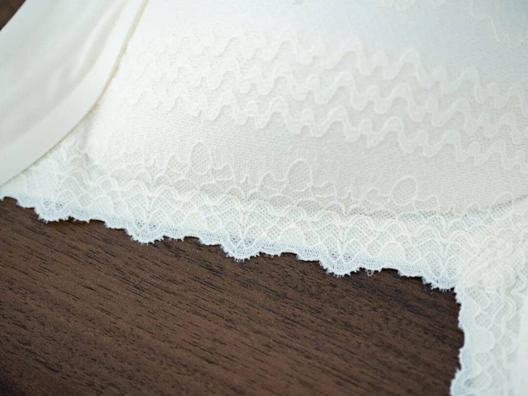这个蕾丝太好看了,让整件颜值变得很高!一看就是用了重工艺,而且而且不扎,属于非常柔软的那种蕾丝。