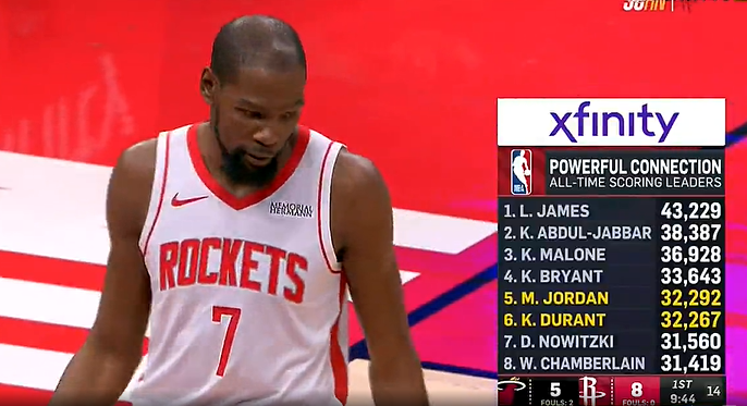 转播镜头给出数据:目前杜兰特得到32267分,距离历史得分榜第五位的乔丹还有26分!